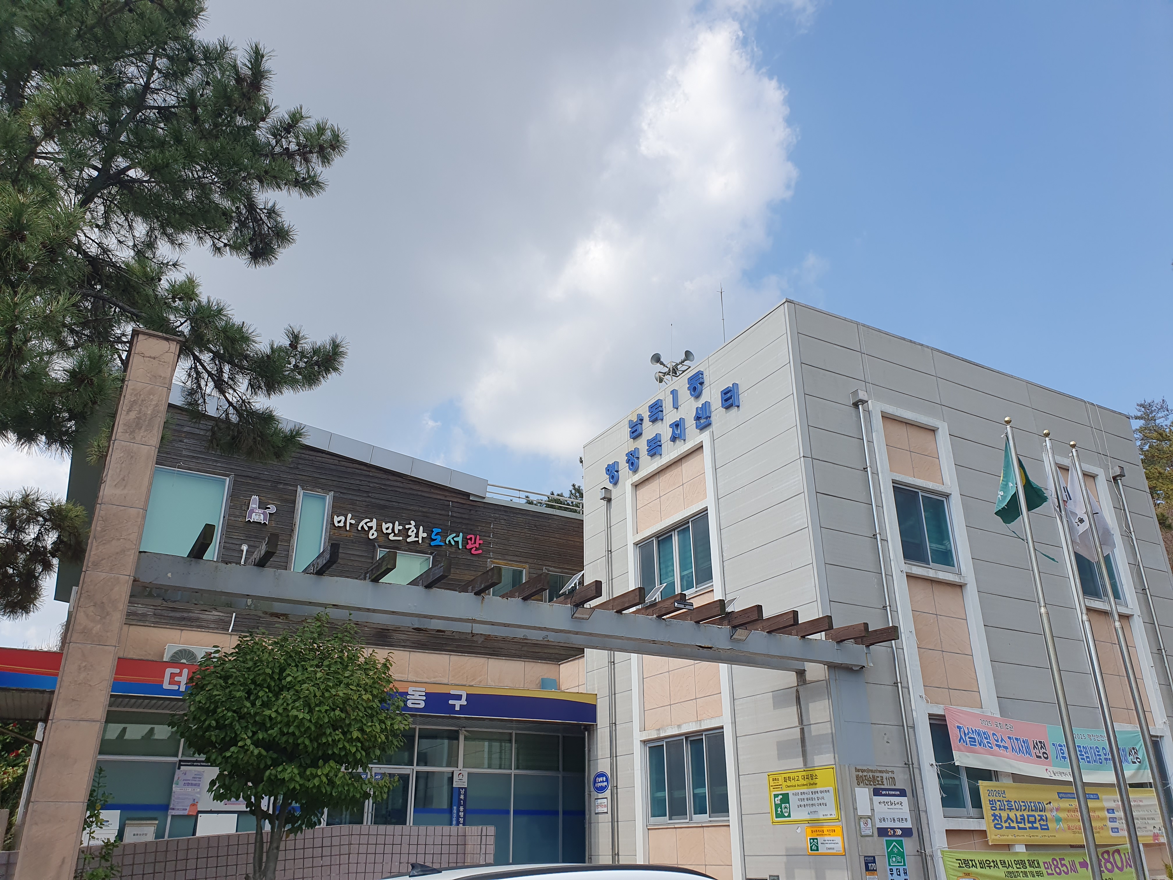 남목1동 행정복지센터 건물의 모습. 작고 아담하다. "마성만화도서관"도 있다.
