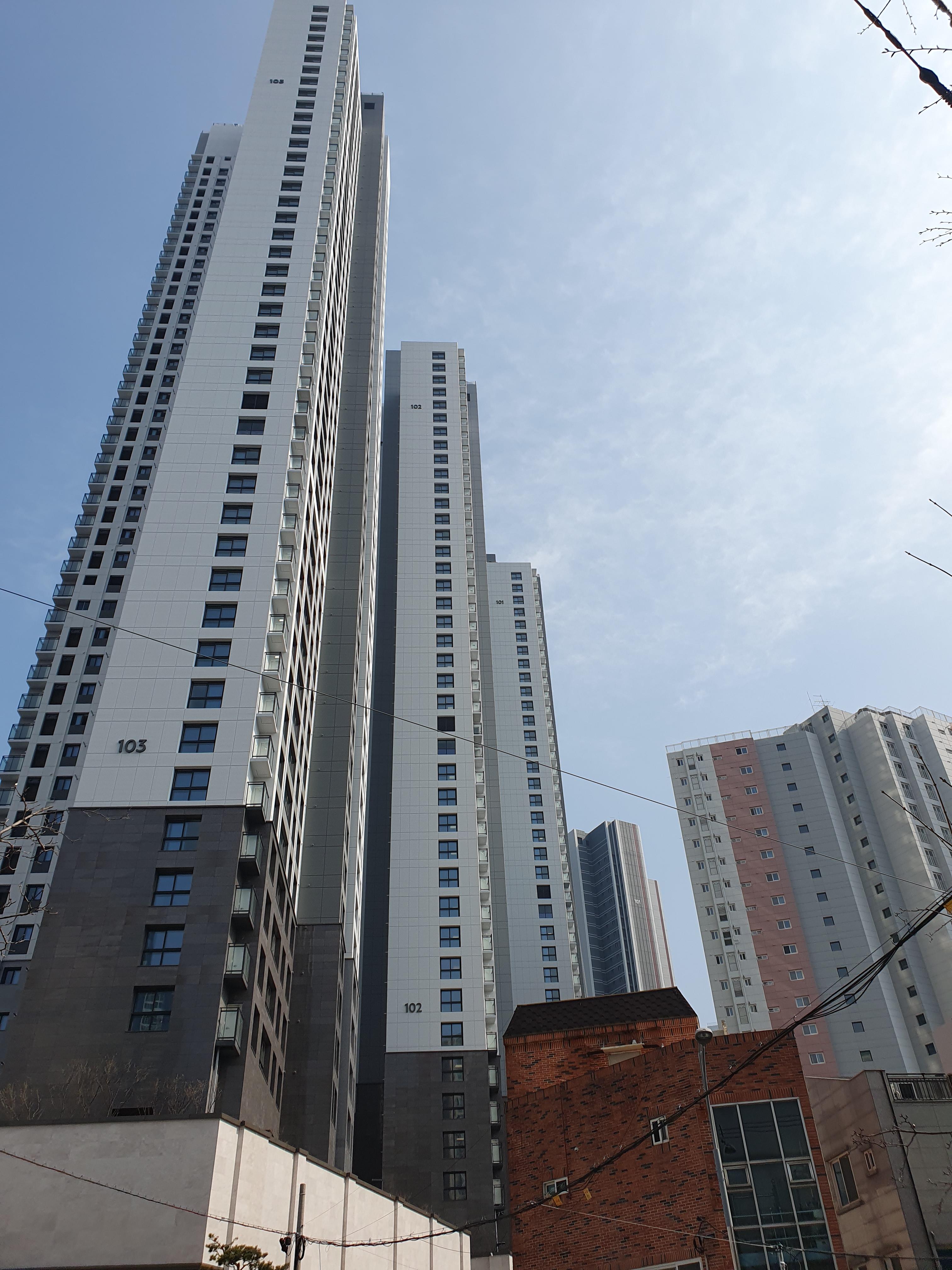 다른 각도에서 사진을 한장 담아보았다. 신축아파트라는 느낌이 들었지만 건물의 외관 디자인은 칙칙하고 고리타분해 보였다. 길쭉길쭉 높게 뻗은 모습이 멋있다기 보단 이질감과 위압감이 더 크게 다가왔다. 울산에 신축되는 요즘 아파트들은 주변 경관과 별로 어울리지 않고, 자연친화적 느낌도 들지 않는것 같다. 공업도시 울산 아니랄까봐, 그저 회색도시 느낌마저 든다. 아파트 건설붐이 한창이던 1990년대의 전형적인 공동주택 디자인에서 크게 벗어나지는 못하는것 같다. 물론 신축아파트를 내 돈으로 영끌해도 살 엄두조차 못낸다. 끝.