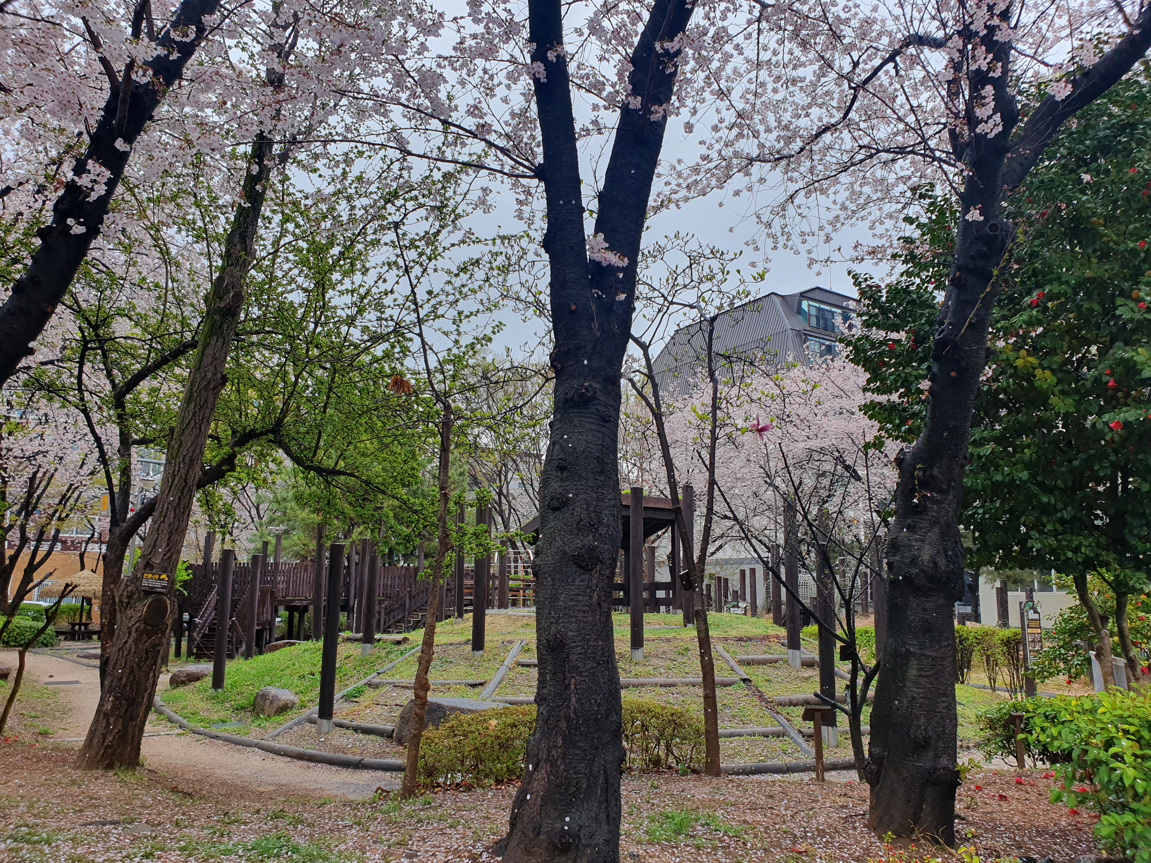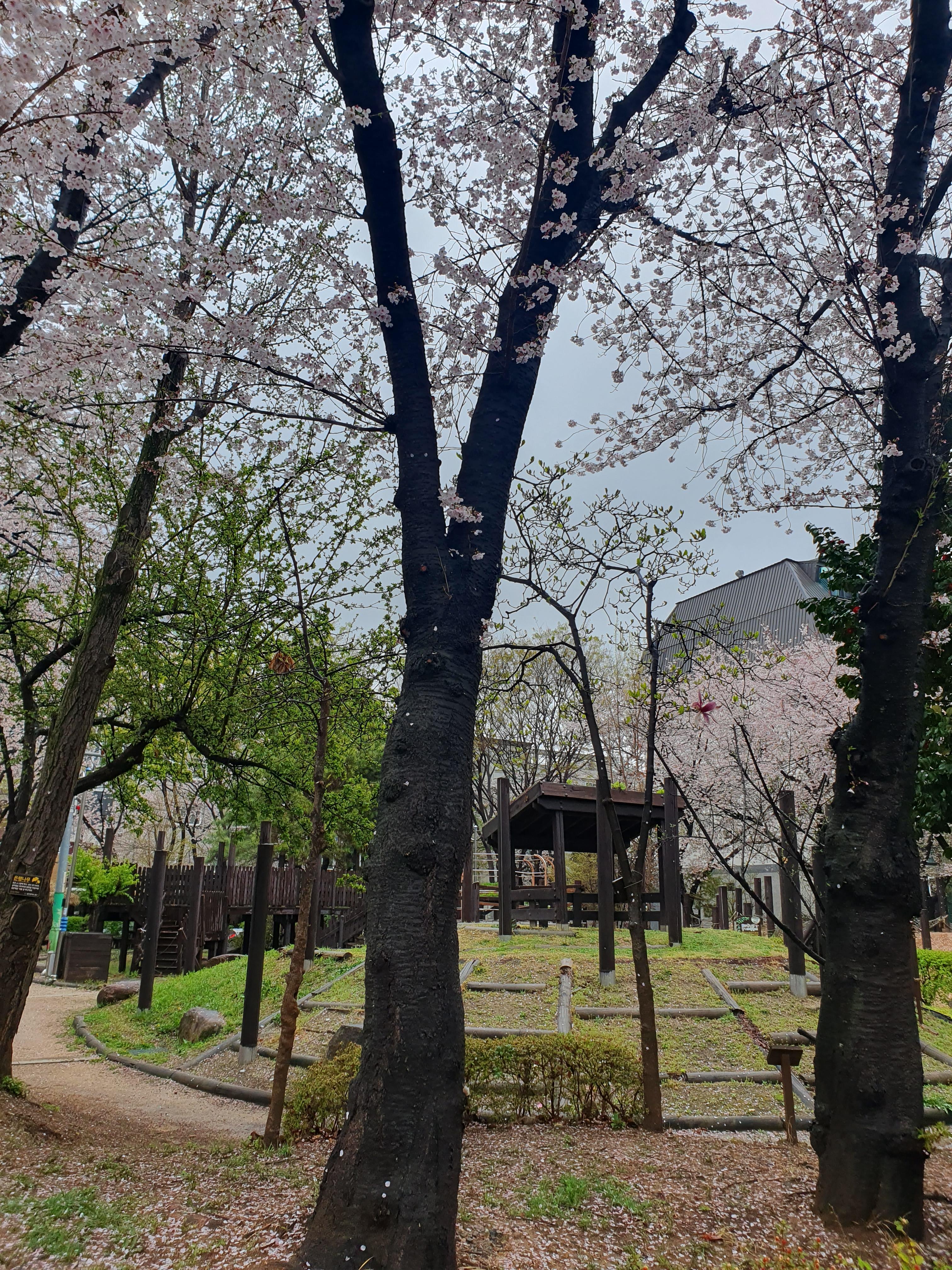 보슬비가 조금씩 내리다가 오후 되어서야 지금은 그친 상태였다. 카페코이 바로 인근에 있는 도심근린공원(새터공원)에 벚꽃이 한창 만개하고 있어서 사진을 몇장 담아보았다.