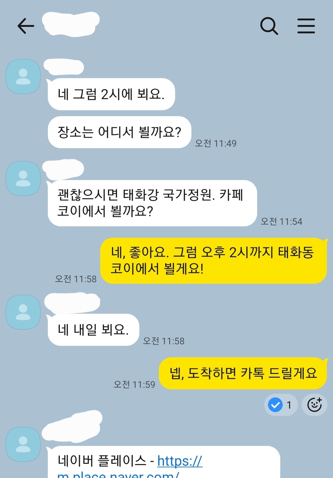 2인 테이블을 잡고나서 맞선 보게 될 상대 여성분께 먼저 도착했다고 카톡으로 연락드렸다. 여성분도 곧 도착한다며 답장을 해주셨다. 약 5분뒤 여성분을 뵐 수 있었다.
